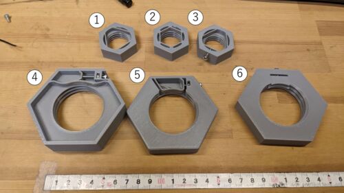 とある事情で3DP製の滑り止めナットを作りたくなりました。 雄ねじ側も3DP製で径は手で回すような結構大きいねじを前提としたものです。 いろいろ試した結果がこちら No1から順に作ってて、最終的にNo6に落ち着いた形です。